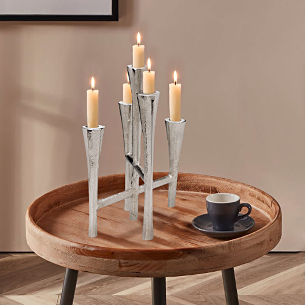 422246 Подсвечник JELLICOE, L235, B180, H290, алюминий, цвет никель создает в помещение уют и прекрасно дополняет интерьер квартиры или загородного дома, оформленный как в классическом, так и современном стиле. Продукцию, принадлежащую к дизайнерскому классу, создают только из самых качественных и безопасных материалов с использованием новейших технологий производства. В ней идеально выверена каждая деталь. Изделие преображает пространство, гармонично сочетая в себе уют, удобство и красоту. Этой стильной модели не страшны капризы моды — и через год, два, пять она будет смотреться также уместно.