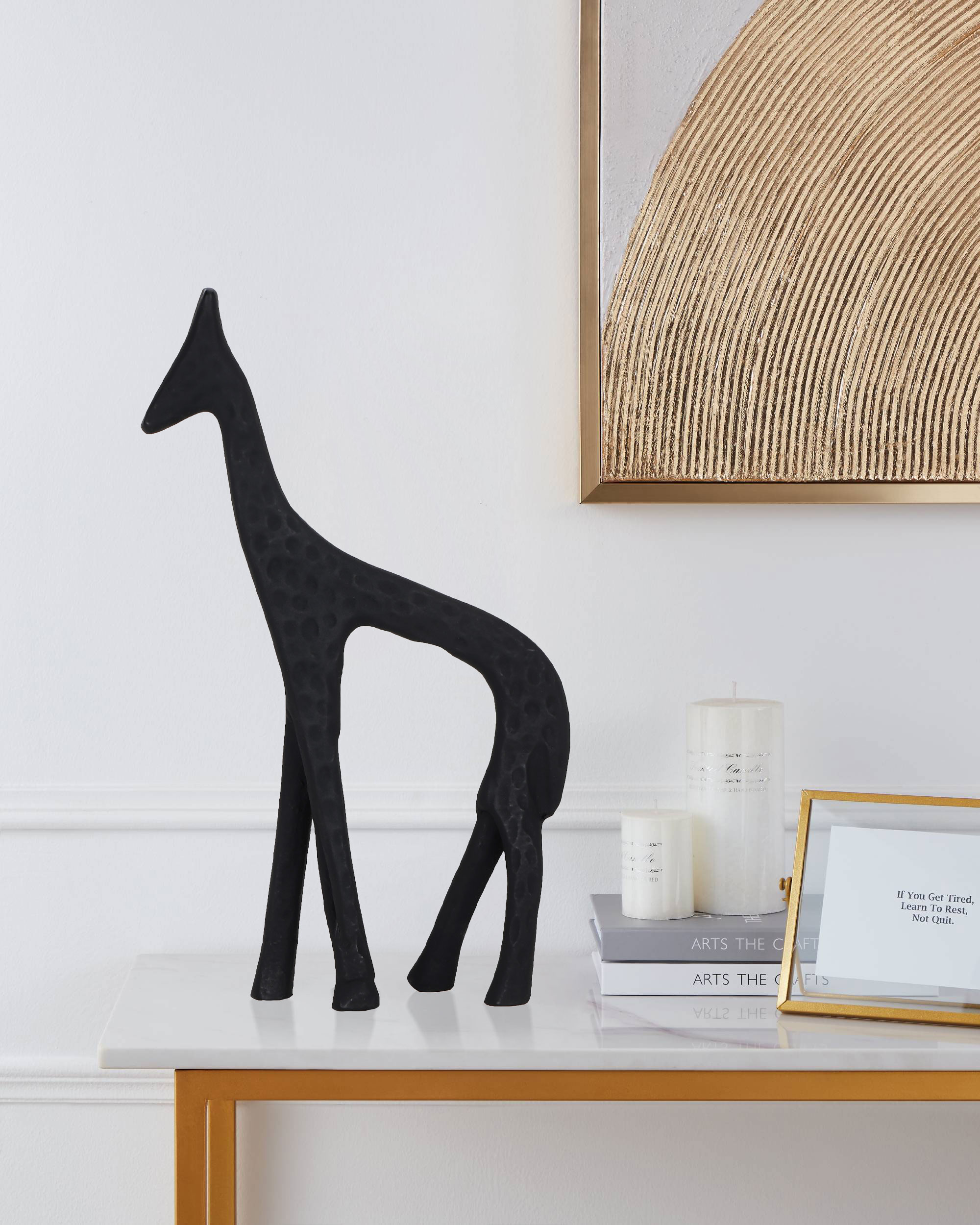 427031 Статуэтка Жираф SUZU, L110, B30, H170, алюминий, черный — это предмет интерьера, способный создать в пространстве неповторимую атмосферу шика и изящества. Четкость линий, благородство форм и идеально продуманная эргономика способны впечатлить и удовлетворить требования самых взыскательных покупателей и придать интерьеру особый колорит.