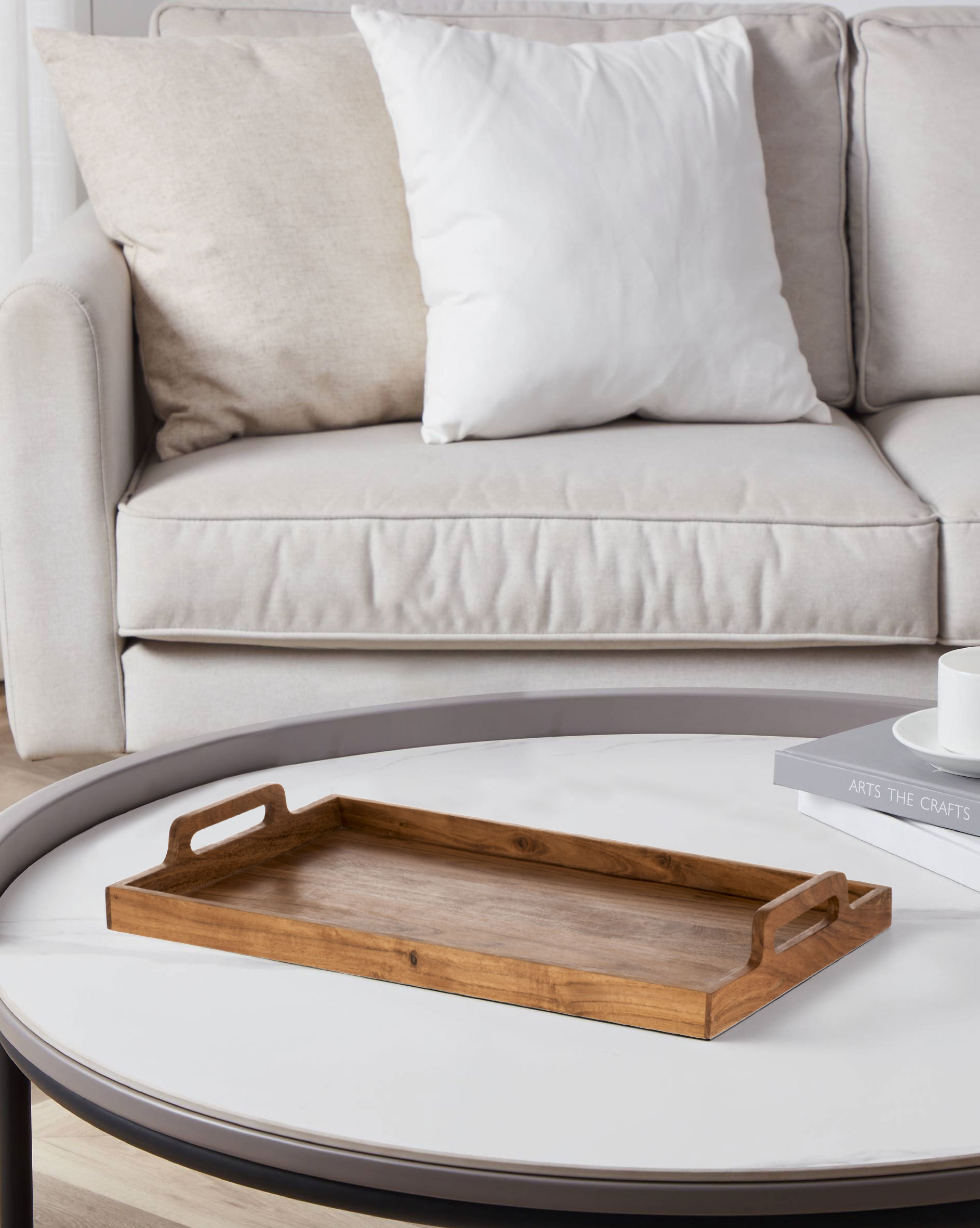427169 Поднос декоративный COCHRANE, L510, B330, H65, дерево, натуральный — это предмет интерьера, способный создать в пространстве неповторимую атмосферу шика и изящества. Четкость линий, благородство форм и идеально продуманная эргономика способны впечатлить и удовлетворить требования самых взыскательных покупателей и придать интерьеру особый колорит.