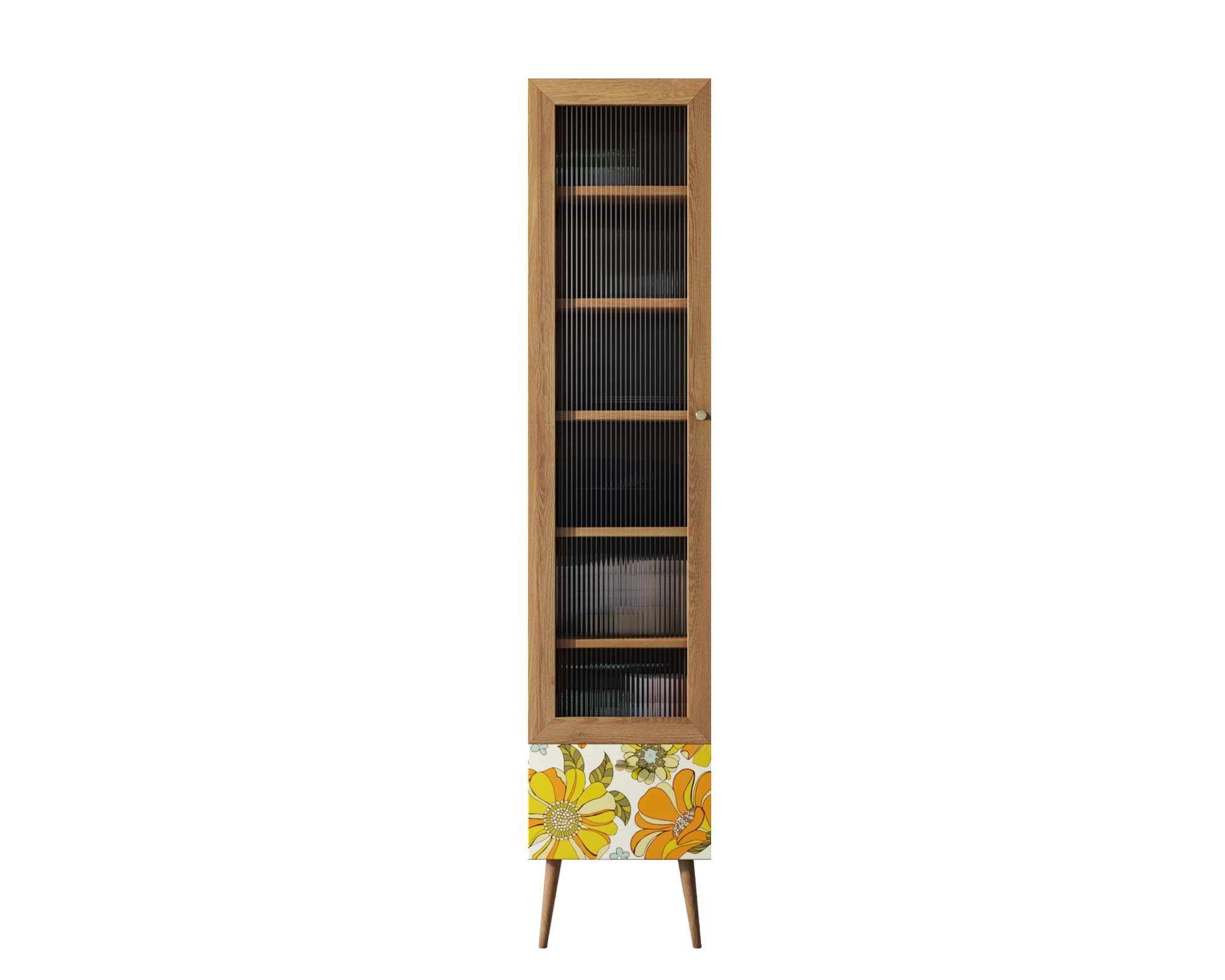 Высокий одностворчатый буфет рекомендуется для просторных интерьеров в скандинавском стиле. Узкая модель отличается большой вместительностью. Тонкие точеные ножки и прозрачная стеклянная дверца с вертикальным узором помогают визуально увеличить высоту помещения. Роль главного акцента играет фасад нижнего выдвижного ящика с ярким цветным флористическим узором.