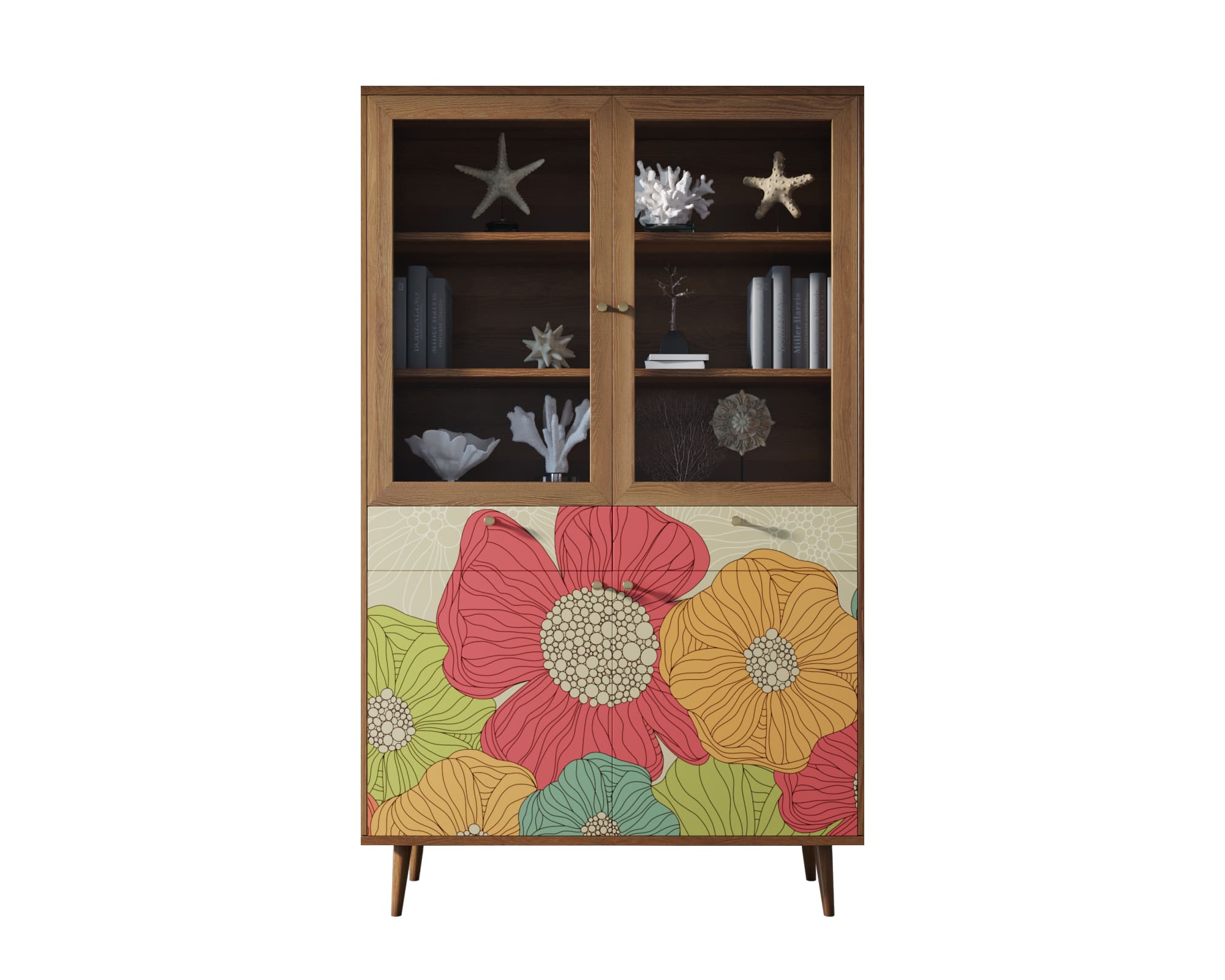 Корпус и ящики изготавливаются из ЛДСП австрийской компании "EGGER". Ножки мы делаем из массива ясеня и крепим на стальную пластину, на дверях петли с доводчиком а на ящиках шариковые направляющие. Принт на фасады наносится принтером специальными УФ - чернилами.