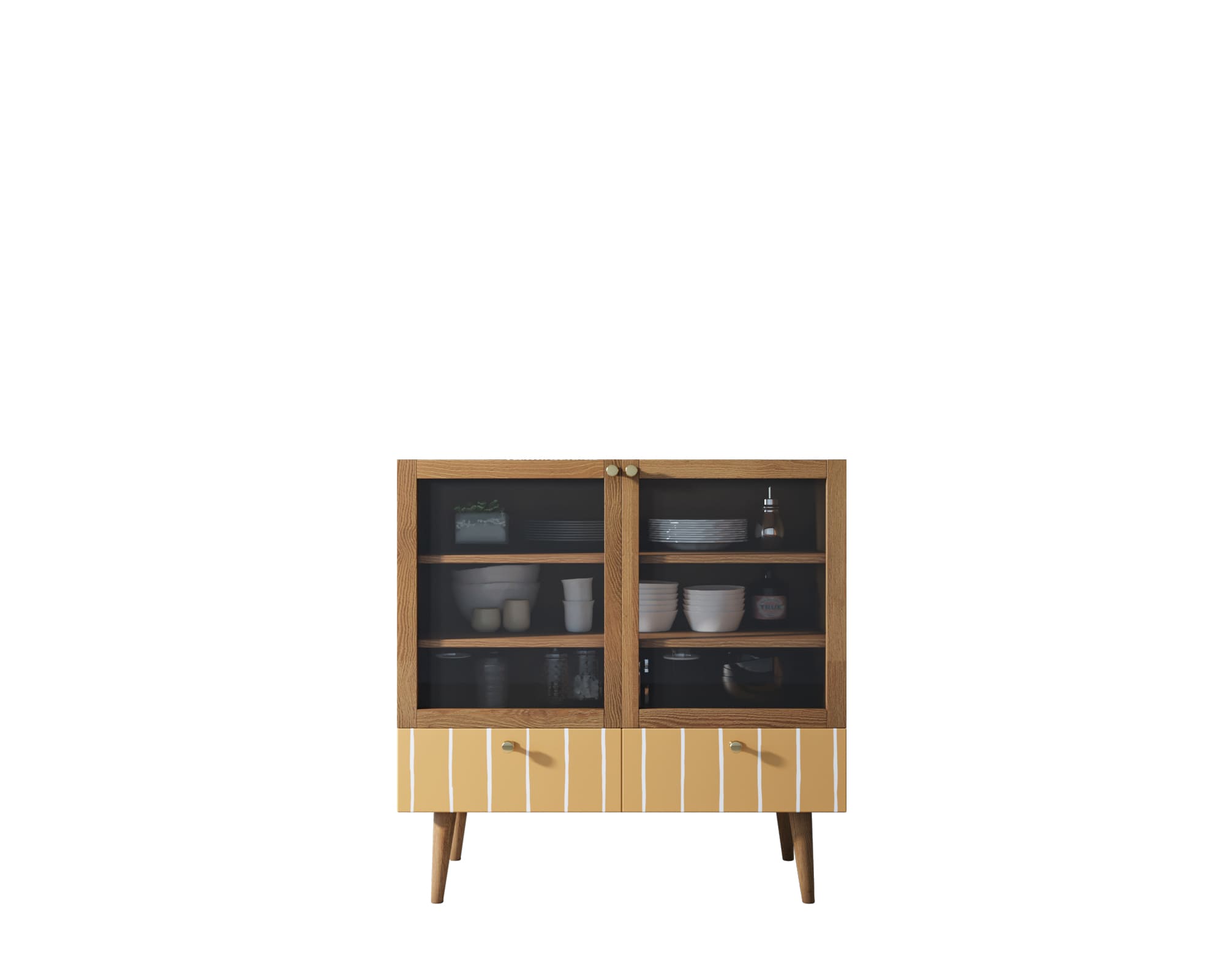 Конструкция буфета позволяет размещать кухонную утварь не только на 6 полках внутри и в нескольких выдвижных ящиках, но и сверху невысокого изделия. Изделие выполнено в скандинавском стиле, но также подходит для интерьеров поп-арт, авангард, кантри и прованс. Каркас собран из прочного ЛДСП, нагрузку на себя берут высокие ножки из массива ясеня.