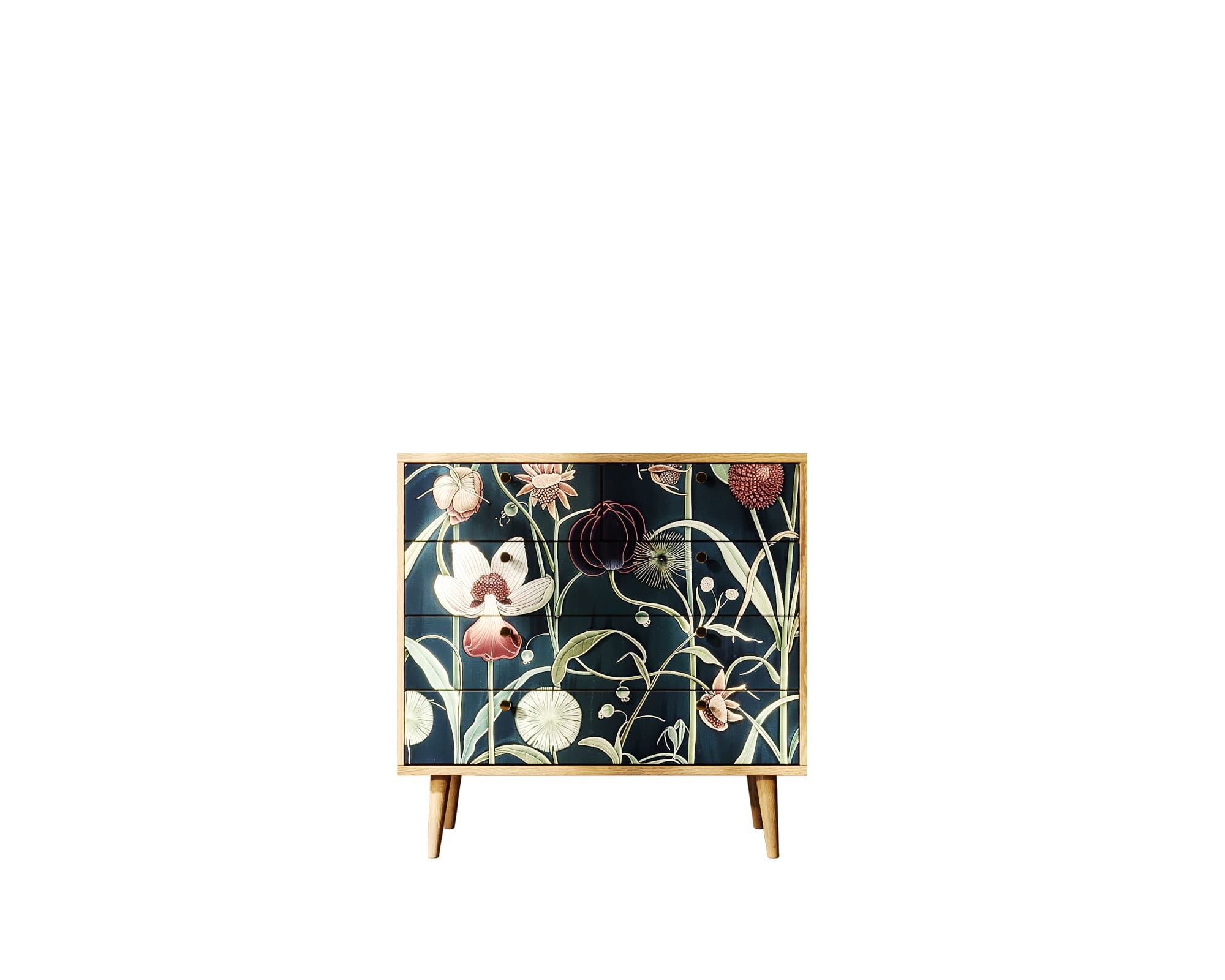Корпус и ящики изготавливаются из ЛДСП австрийской компании "EGGER". Ножки мы делаем из массива ясеня и крепим на стальную пластину, на дверях петли с доводчиком а на ящиках шариковые направляющие. Принт на фасады наносится принтером специальными УФ - чернилами.