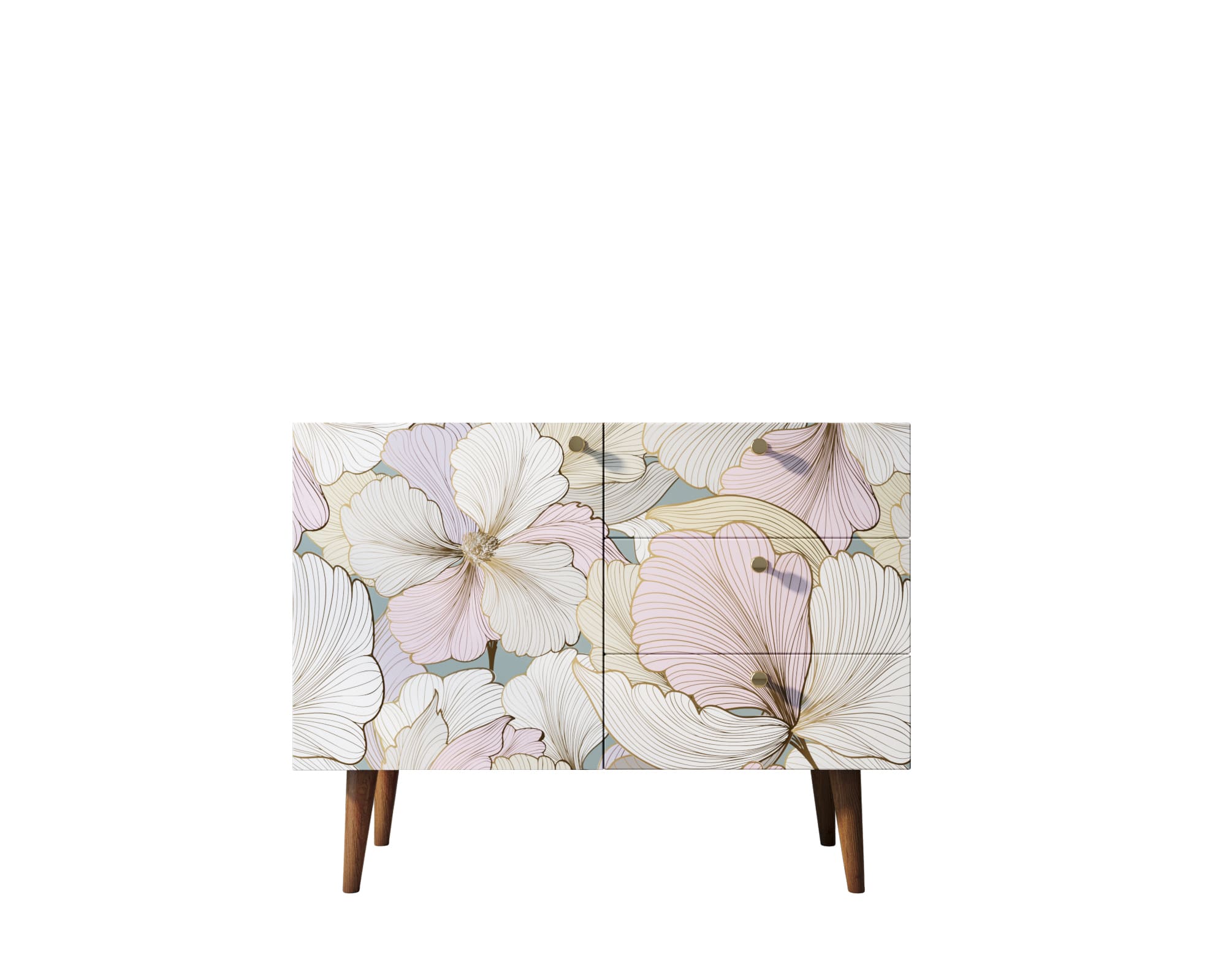 В компактном комоде три ящика и полка в левой секции за дверкой. Фасад украшает принт в спокойных тонах. Петли на дверях с доводчиком, ящики на шариковых направляющих. Для изготовления модели применены два вида материалов: ЛДСП для корпуса и массив ясеня для ножек.
