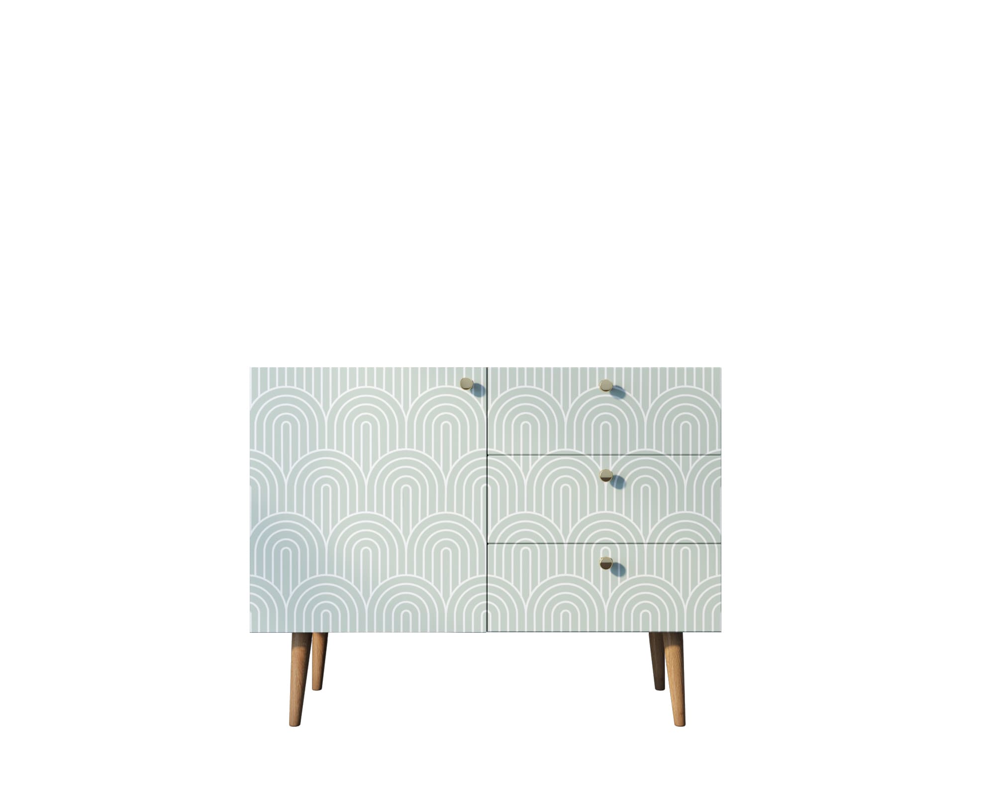 В компактном комоде три ящика и полка в левой секции за дверкой. Фасад украшает принт в спокойных тонах. Петли на дверях с доводчиком, ящики на шариковых направляющих. Для изготовления модели применены два вида материалов: ЛДСП для корпуса и массив ясеня для ножек.