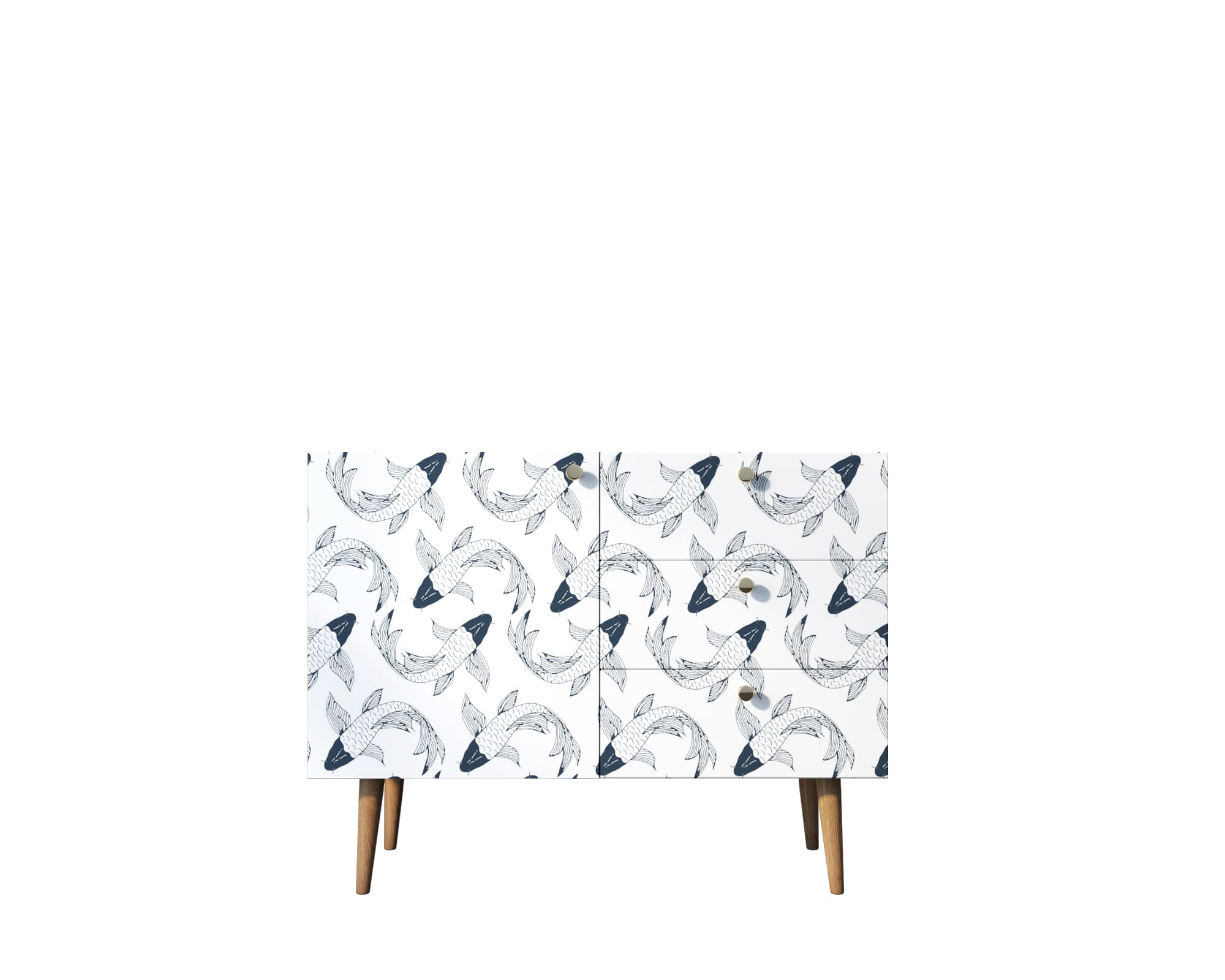 В компактном комоде три ящика и полка в левой секции за дверкой. Фасад украшает принт в спокойных тонах. Петли на дверях с доводчиком, ящики на шариковых направляющих. Для изготовления модели применены два вида материалов: ЛДСП для корпуса и массив ясеня для ножек.