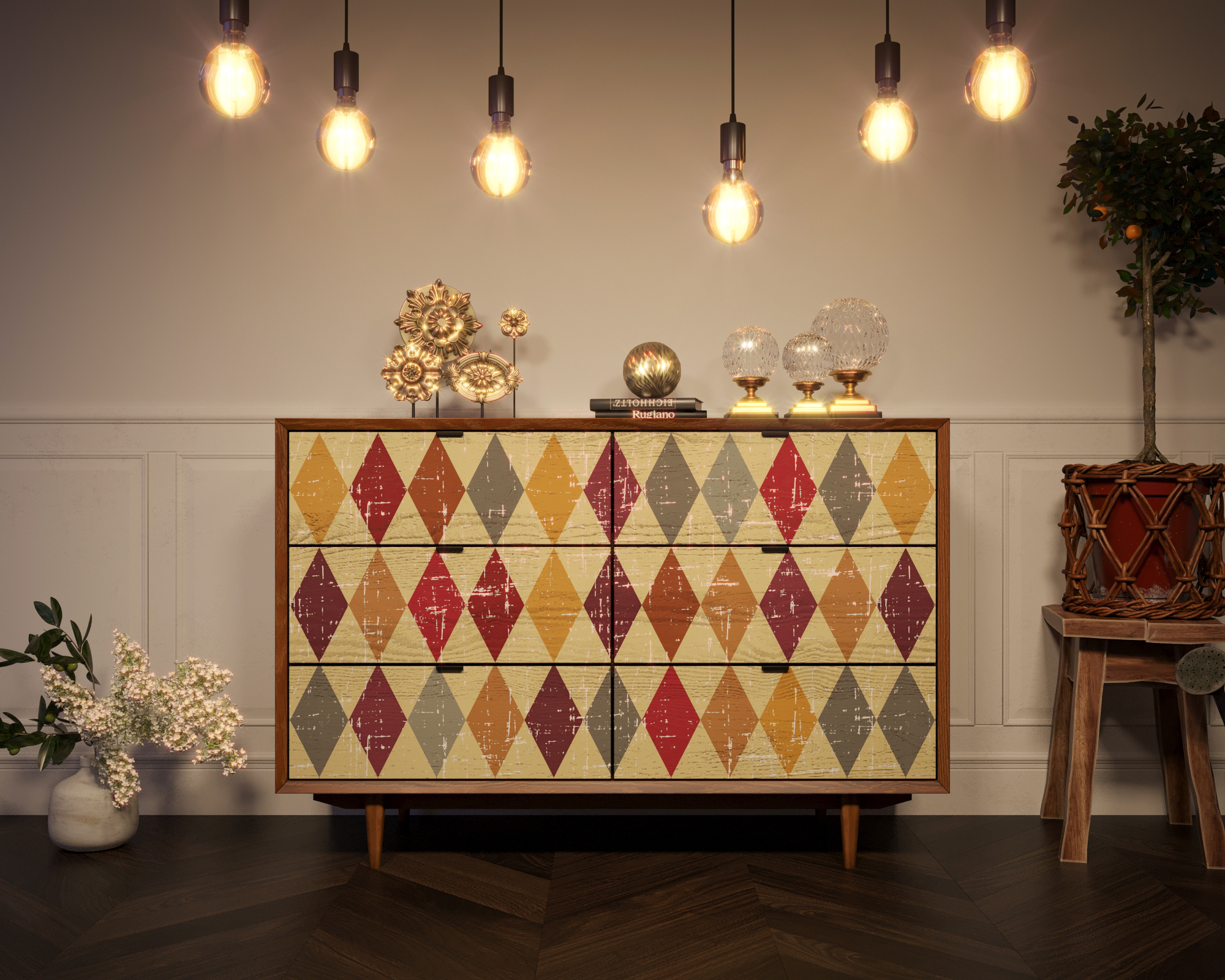 Комод "Bruni print" с шестью ящиками. Скандинавский стиль в интерьере - это универсальность, простота и в то же время непревзойденная индивидуальность. Лаконичный, вместительный и очень практичный комод "Bruni" сочетает в себе все эти характеристики. Благородство дерева и строгость линий наполнят Ваш дом особой атмосферой.