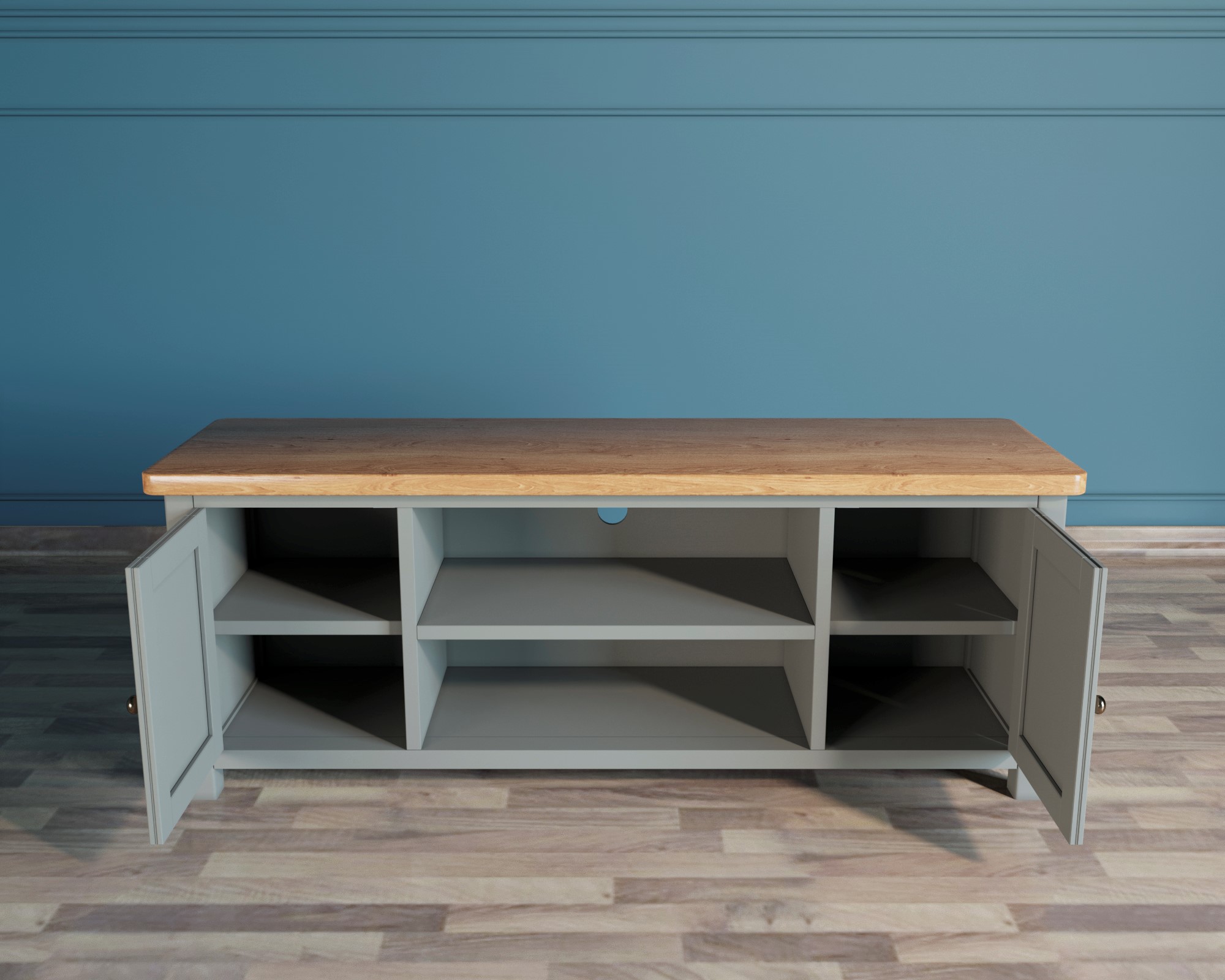 Стиль кантри в интерьере - это прежде всего натуральность материалов, уютная простота и удобство. Утонченный и практичный комод под ТВ "Jules Verne" сочетает в себе все эти характеристики. Стильный серый цвет, идеальная геометрия форм, кованые ручки и фактурная ясеневая столешница придадут интерьеру еще немного шарма.