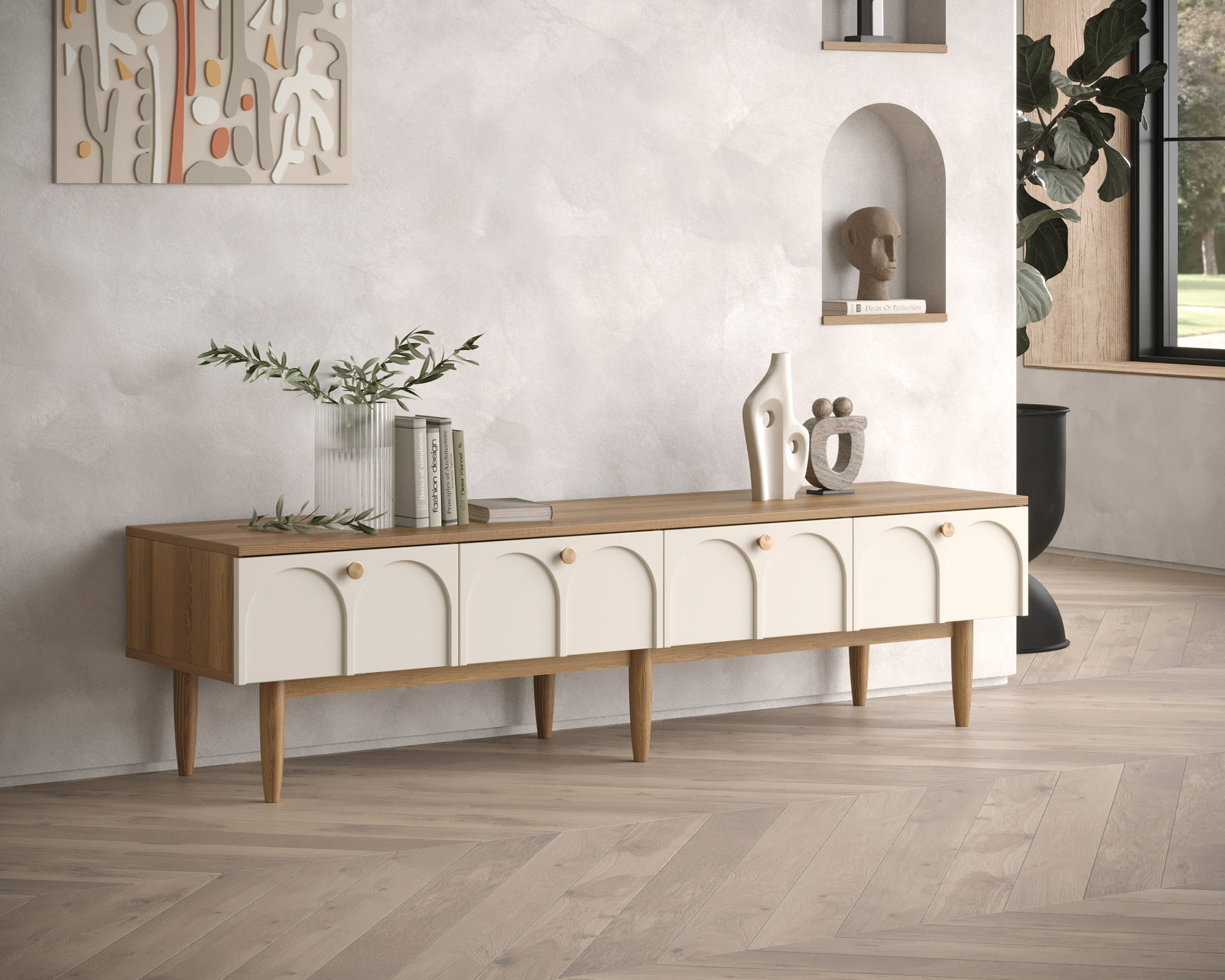 Данный комод в стиле Джапанди представляет собой гармоничное сочетание японской минималистичности и скандинавской функциональности. Он воплощает в себе принципы простоты, природных материалов и элегантной практичности. Его геометрия тщательно продумана, что делает его визуально легким и воздушным, придавая пространству ощущение спокойствия и гармонии.