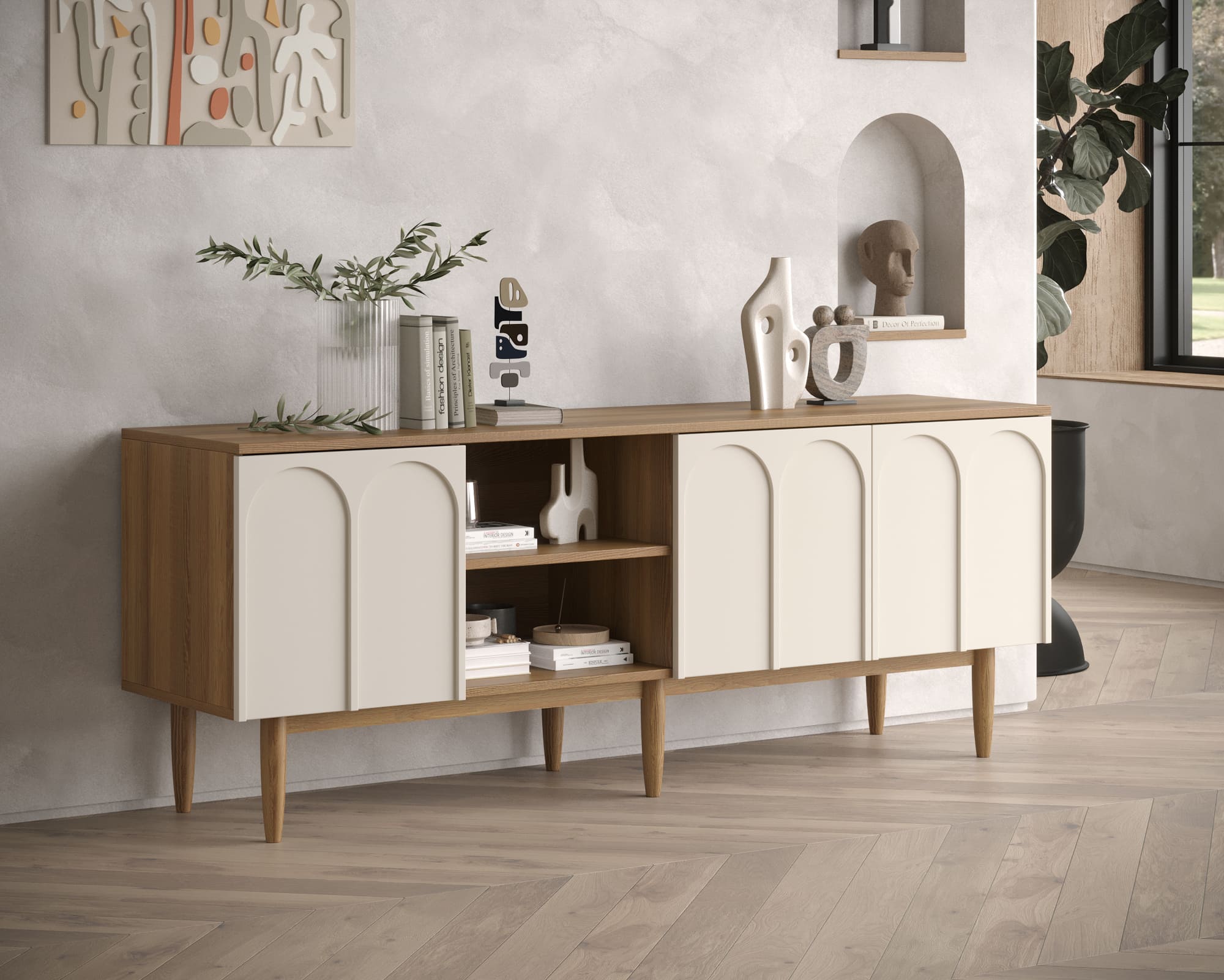 Данный комод в стиле Джапанди представляет собой гармоничное сочетание японской минималистичности и скандинавской функциональности. Он воплощает в себе принципы простоты, природных материалов и элегантной практичности. Его геометрия тщательно продумана, что делает его визуально легким и воздушным, придавая пространству ощущение спокойствия и гармонии.