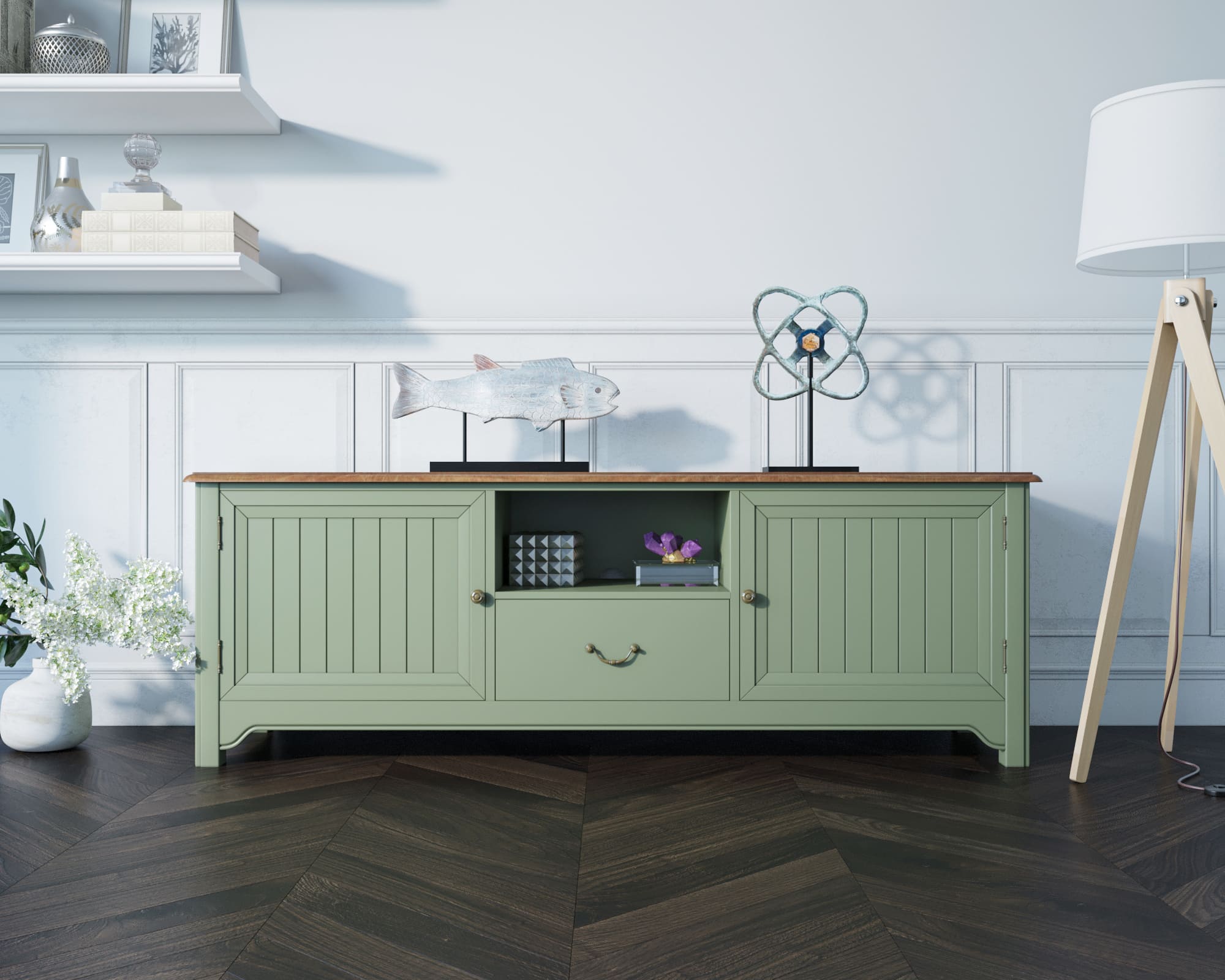 Выбор в пользу консоли под TV "Olivia" - правильное решение. Ее ящик и отделения за дверцами достаточно вместительные, а посередине Вы сможете разместить необходимую аппаратуру, отверстие под вывод шнуров делается по запросу. Приятный оливковый цвет, фрезеровка на дверках, кованые ручки и фактурная ясеневая столешница придадут интерьеру еще немного шарма.