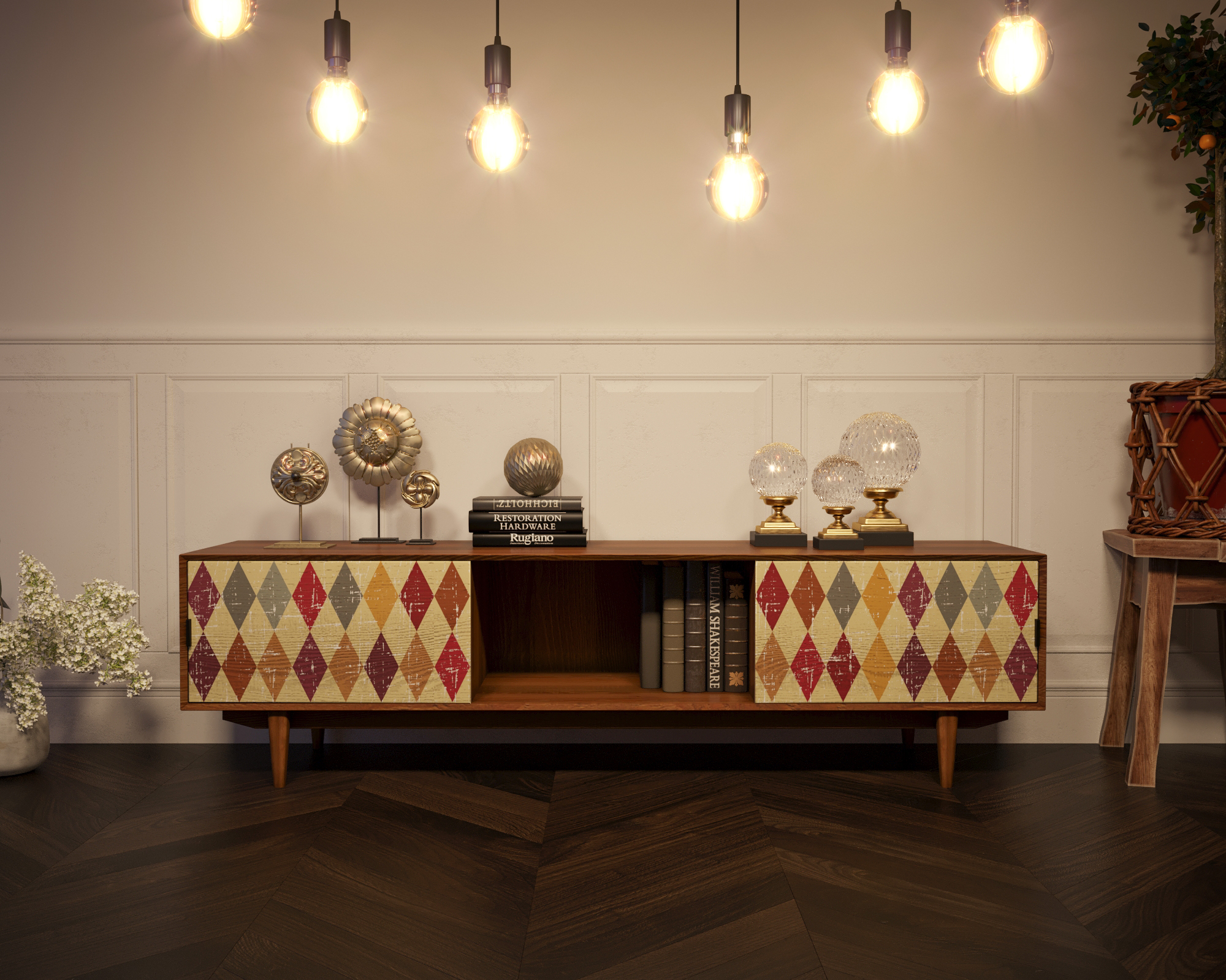 Мне посоветовали приобрести эту консоль. Принт с изображением разноцветных ромбов эффектно смотрится. Вверху установил телевизор с диагональю 55 дюймов без трудностей. Внутри консоли удалось разместить динамики. Консоль действительно стоящая.