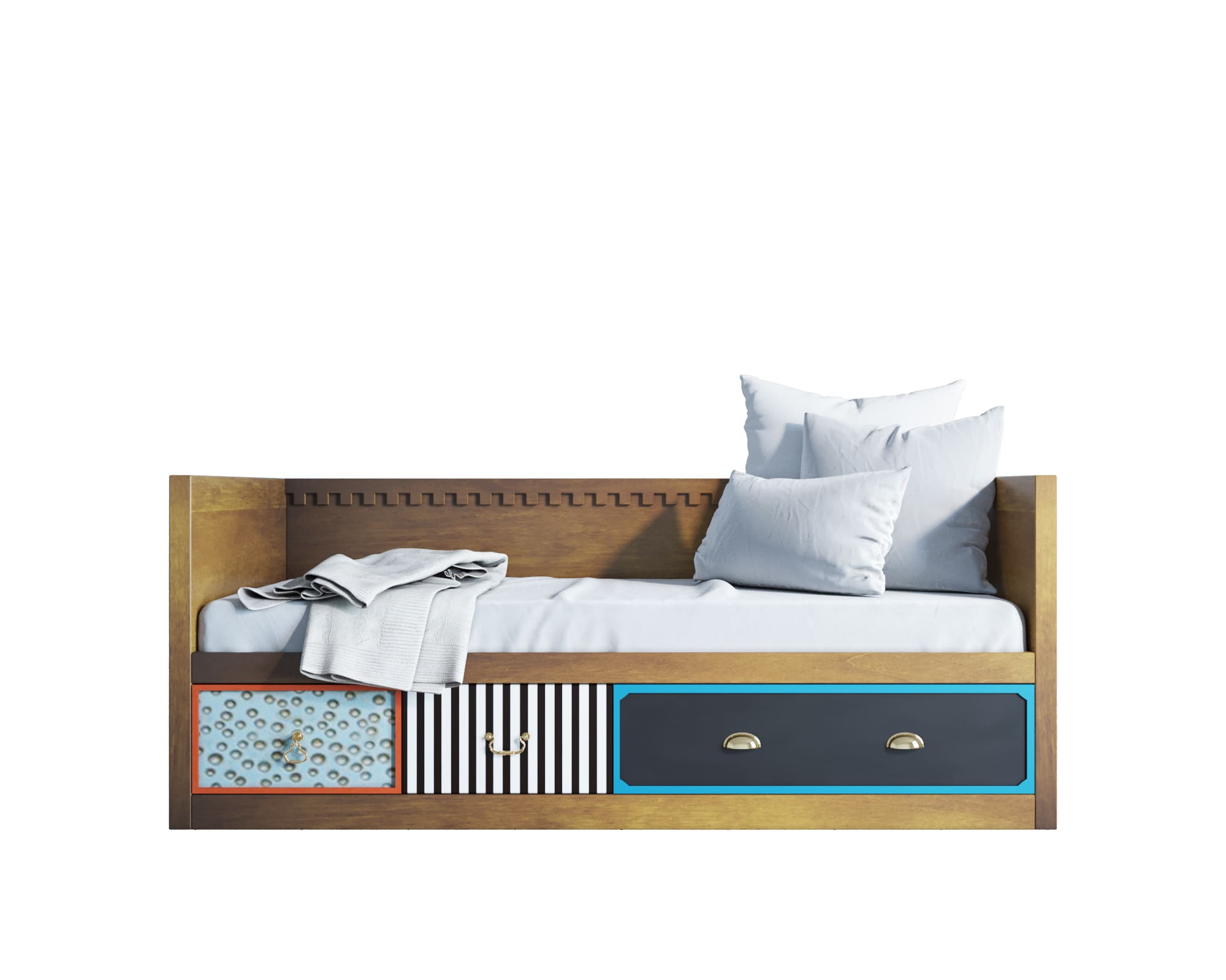 Кровать-кушетка "Gouache" с ящиками арт M10509К отличается компактным размером и функциональностью. Её корпус изготовлен из массива березы и дерева. Эти материалы прочные, они устойчивы к износу. Корпус окрашен в светло-коричневый оттенок, четко прослеживается текстура дерева. Для данной кровати подходит размер матраса 90 на 190 см. Форма у кровати-кушетки прямоугольная, внизу находятся выдвижные ящики. В них будет удобно хранить различные вещи, чтобы они не занимали место в помещении. Кровать-кушетка "Gouache" с ящиками арт M10509К продаётся в Москве, она выполнена в стиле поп-арт. Выглядит изделие оригинально, оно отличается стильным дизайном и необычным видом. Кровать-кушетка подойдет как для детской комнаты, так и для спальни. Это отличный вариант для небольшой комнаты, так как данная мебель не займет много места.