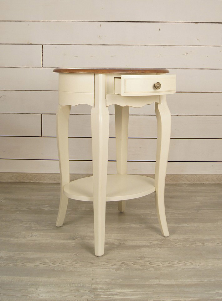 Одно слово – очаровательно)) Симпатичный овальный столик стоит в углу у кровати. Свое предназначение выполняет на 200%: на крышке светильник, телефон, книга, а на полочке и в ящичке найдется место для других аксессуаров. Придает помещению нарядности, поднимает настроение!