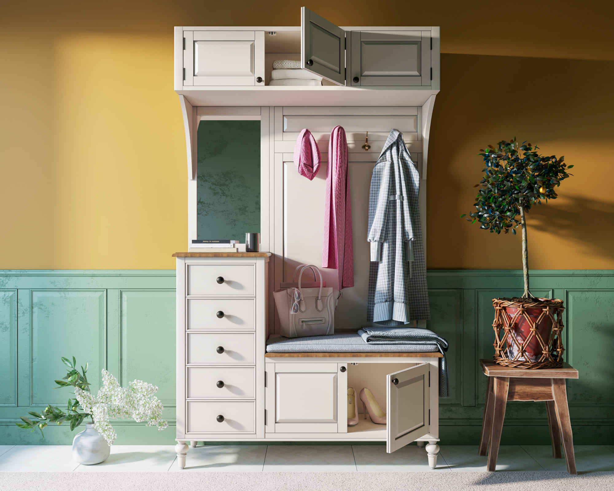 Этот шкаф, изготовленный из прочного массива березы сэкономит пространство прихожей и станет универсальным хранилищем для вещей или обуви. Белоснежный цвет в сочетании с ясеневыми столешницами наполнят Ваш дом французским шармом. Взгляните по-новому на привычные вещи!