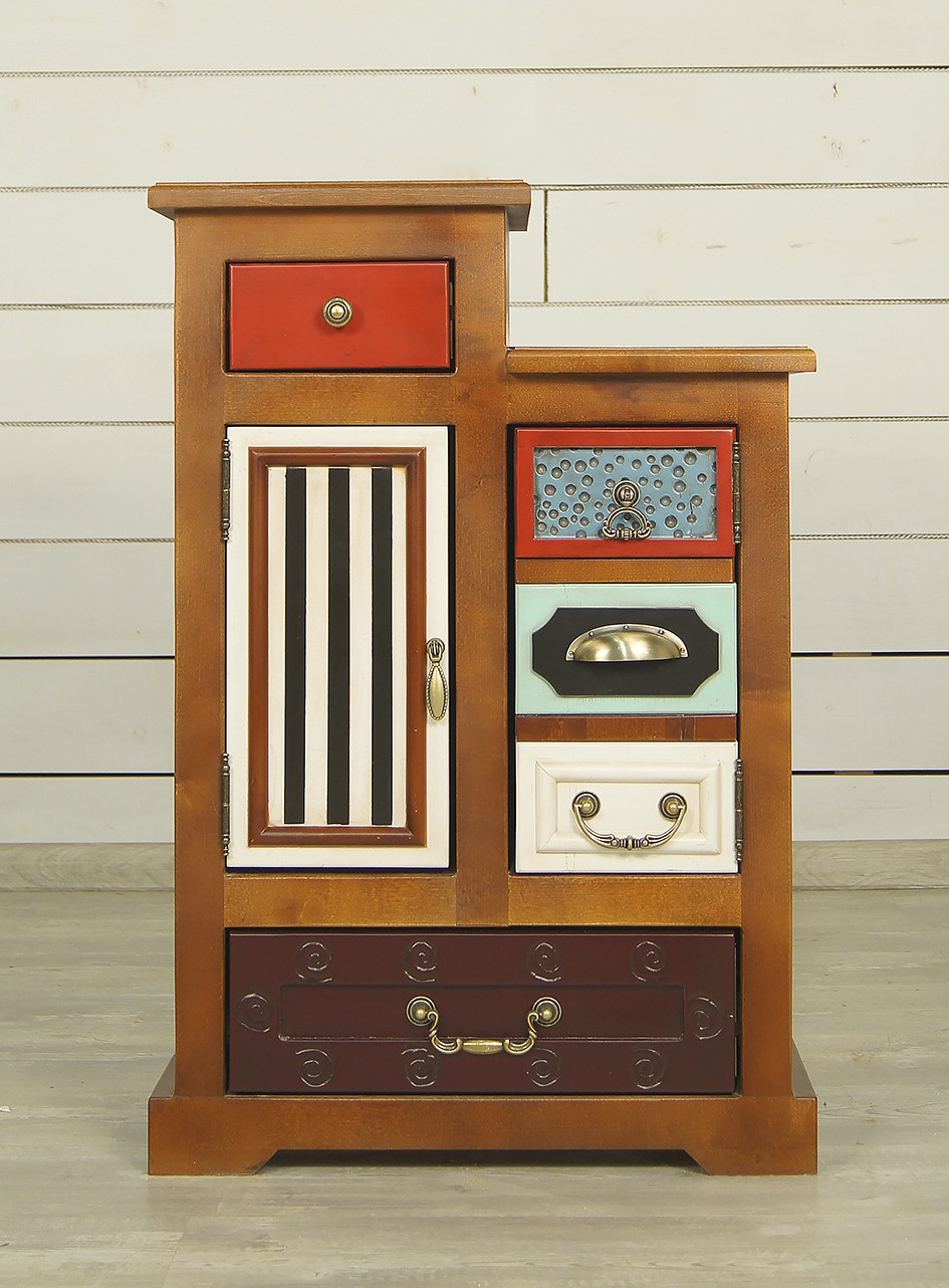 Нестандартная и яркая модель асимметричной прикроватной тумбы. В интерьере спальни она станет настоящей приманкой для глаз. Полезное пространство разделено на вместительные отделения с распашными дверцами и выдвижные ящики разного размера. Дизайн каждого фасада представляет собой мини-шедевр, дополненный оригинальной латунной фурнитурой.