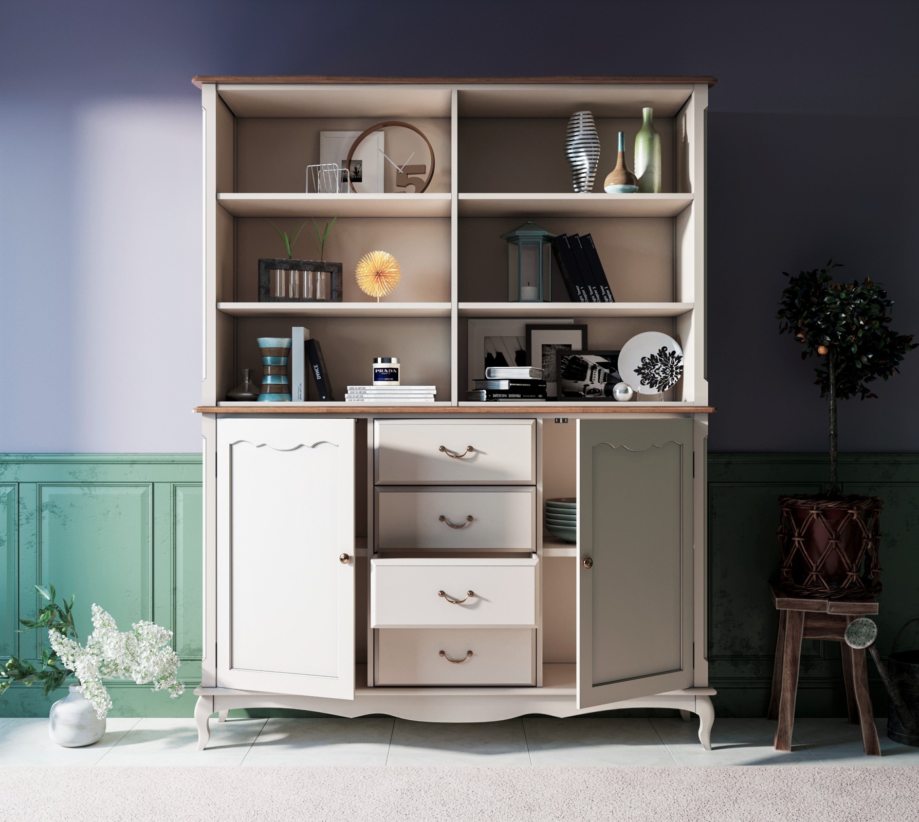 Перед Вами элегантный светло-бежевый шкаф c открытыми верхними полками из коллекции “Leontina”. Основные элементы шкафа выполнены из натуральной березы, а прочные полки изготовлены из массива ясеня. Этот предмет мебели отлично впишется в гостиную и придаст ей французской романтичности.