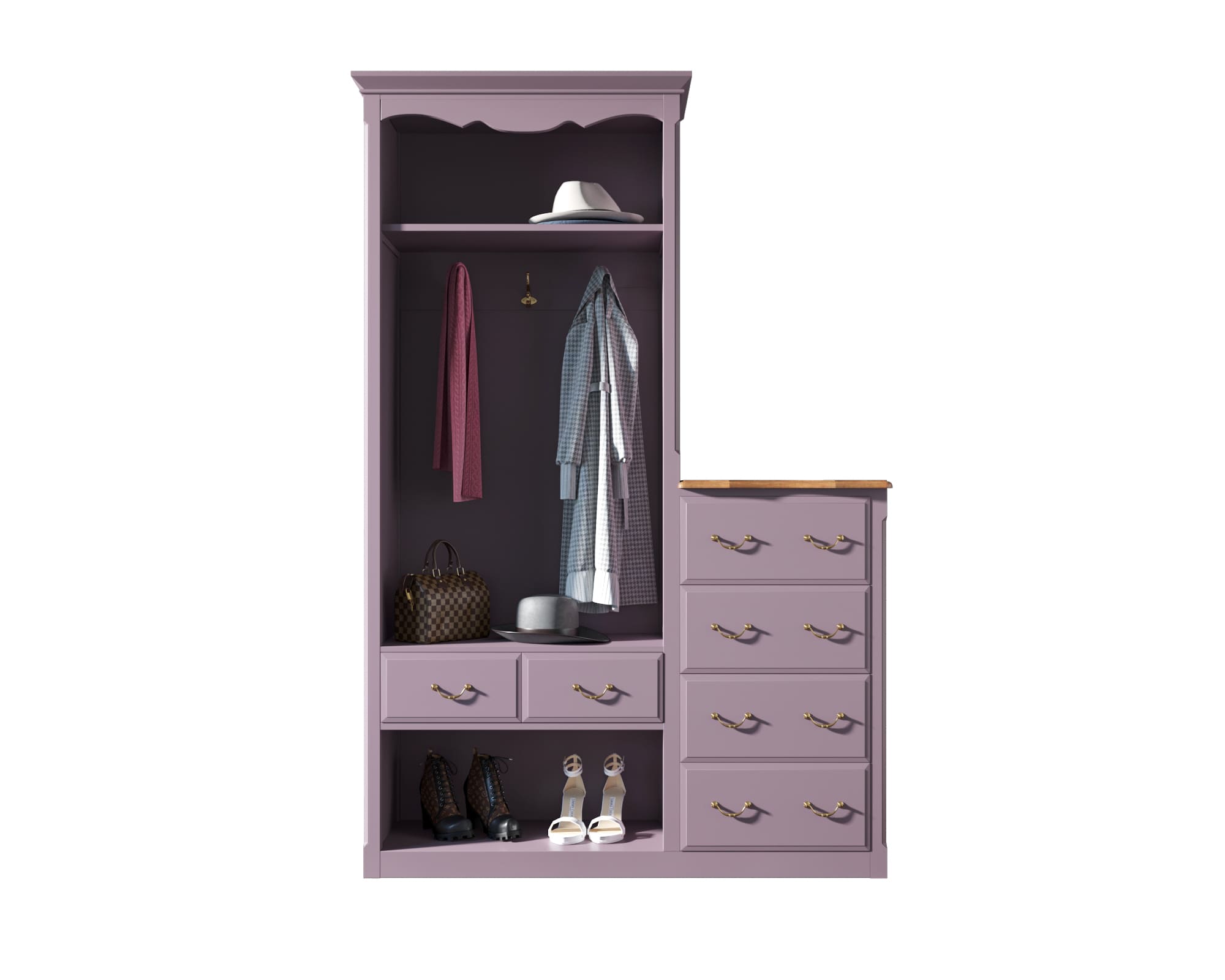 Этот шкаф, изготовленный из прочного массива березы сэкономит пространство прихожей и станет универсальным хранилищем для вещей или обуви. Дуэт высокого шкафа с открытой полкой для верхней одежды и боковой комод с четырьмя выдвижными ящиками выполнен в классическом французском стиле Прованс.