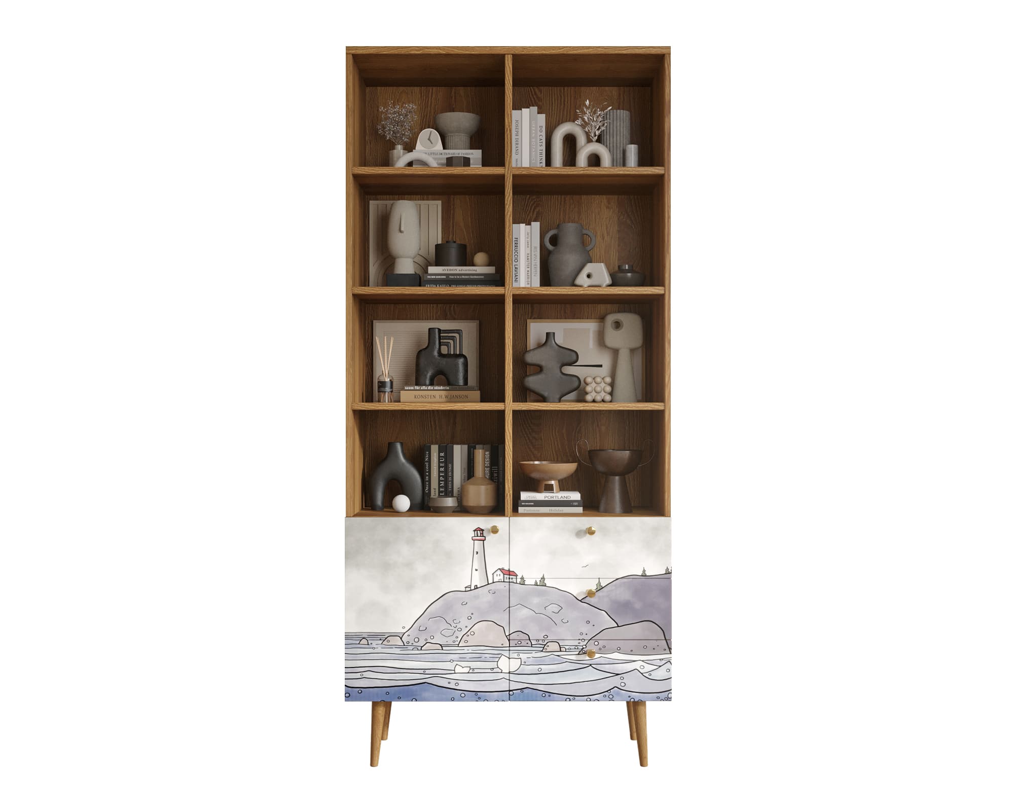Стеллаж с дизайнерским принтом на фасаде имеет три небольших ящика полного выдвижения на шариковых направляющих. Левая секция за дверкой разделена полкой, которая регулируется по высоте. Ноги изготовлены из прочного массива ясеня.