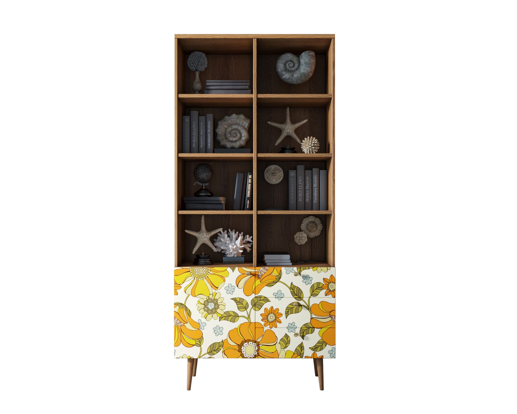 Стеллаж с дизайнерским принтом на фасаде имеет три небольших ящика полного выдвижения на шариковых направляющих. Левая секция за дверкой разделена полкой, которая регулируется по высоте. Ноги изготовлены из прочного массива ясеня.