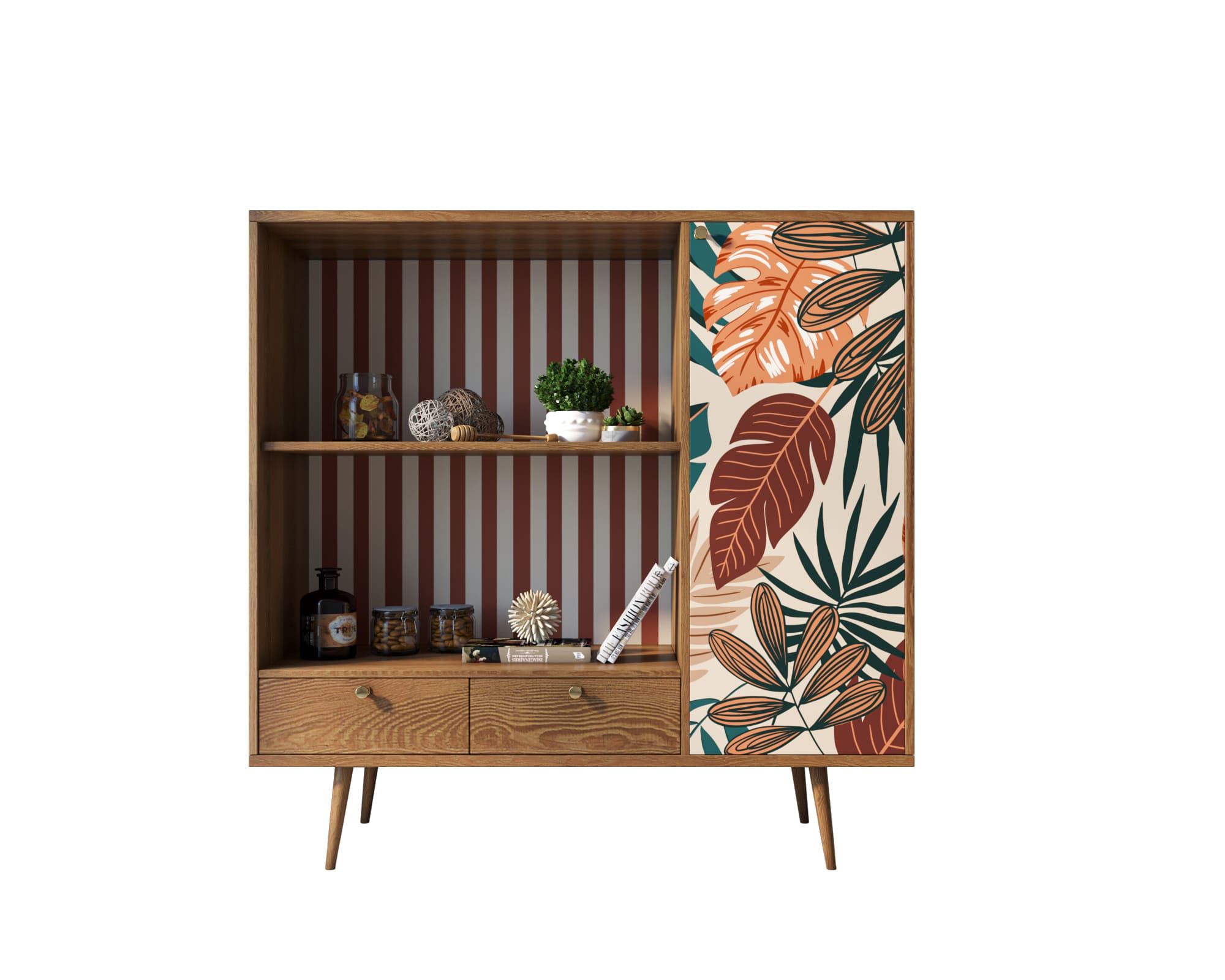 Небольшой стеллажик "Berber" с двумя ящиками и дверкой отлично впишется в гостиную и будет симпатичным акцентом в интерьере. Выберете подходящий принт, разместите на полках немного декора, свечей или книг и получите не только красивую, но и функциональную вещь.