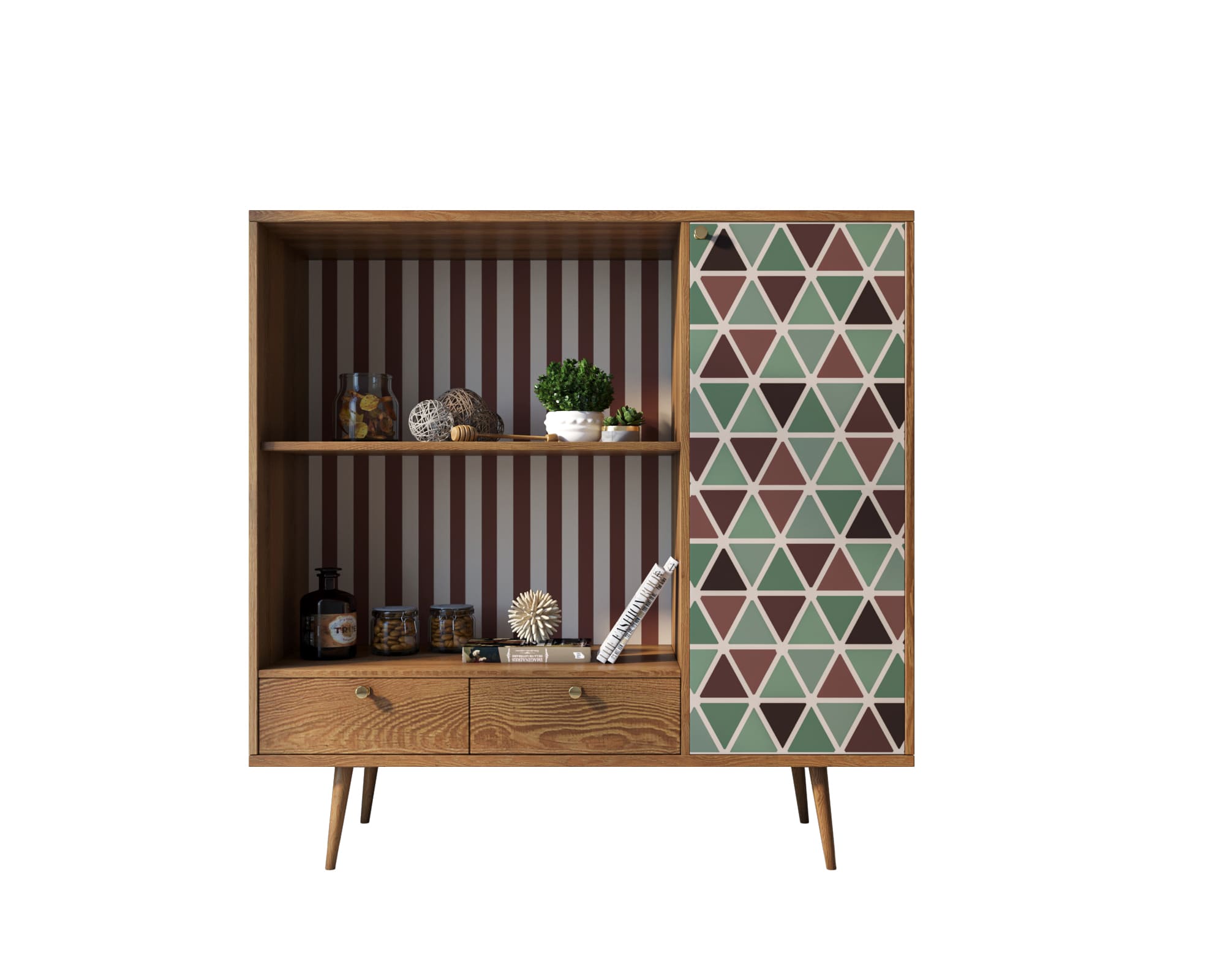 Небольшой стеллажик "Berber" с двумя ящиками и дверкой отлично впишется в гостиную и будет симпатичным акцентом в интерьере. Выберете подходящий принт, разместите на полках немного декора, свечей или книг и получите не только красивую, но и функциональную вещь.
