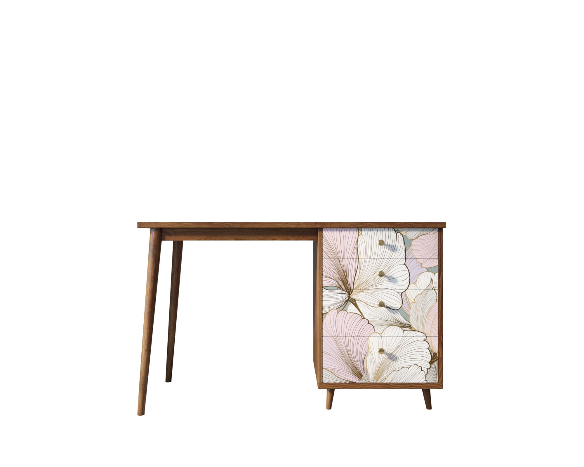 Рабочий стол "Berber" имеет четыре ящика на шариковых направляющих, цельное подстолье из натурального ясеня для улучшения устойчивости и дизайнерский принт на фасаде, который можно заменить по вашему желанию.
