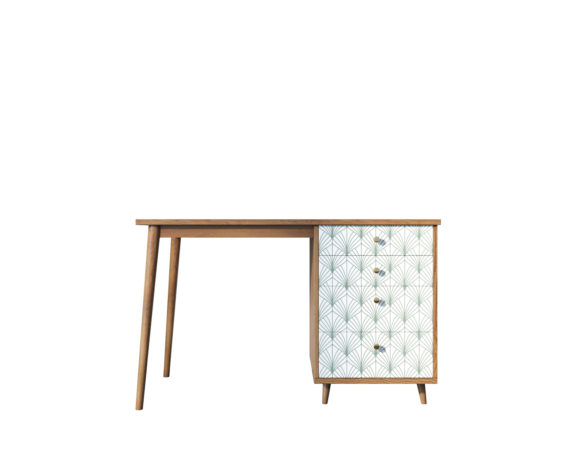 Рабочий стол "Berber" имеет четыре ящика на шариковых направляющих, цельное подстолье из натурального ясеня для улучшения устойчивости и дизайнерский принт на фасаде, который можно заменить по вашему желанию.