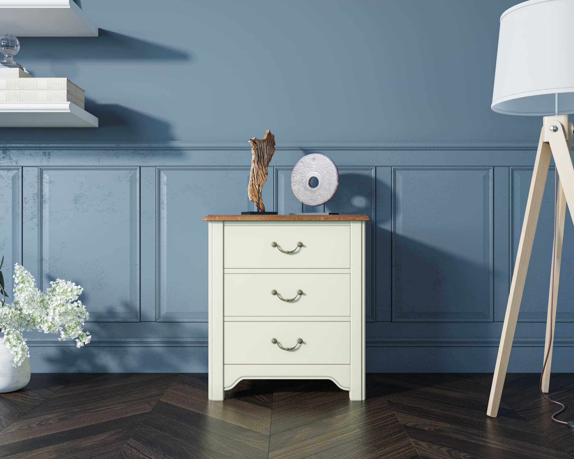 Вместительная тумбочка снабжена тремя выдвижными ящиками. Компактные размеры 54*40 позволят не расходовать много места рядом с кроватью, но при этом хранить нужные вещицы или предметы на расстоянии вытянутой руки. Тумба выполнена в стиле французского кантри. Данный стиль отлично впишется в спальню или прихожую, добавив легкости и уюта интерьеру.
