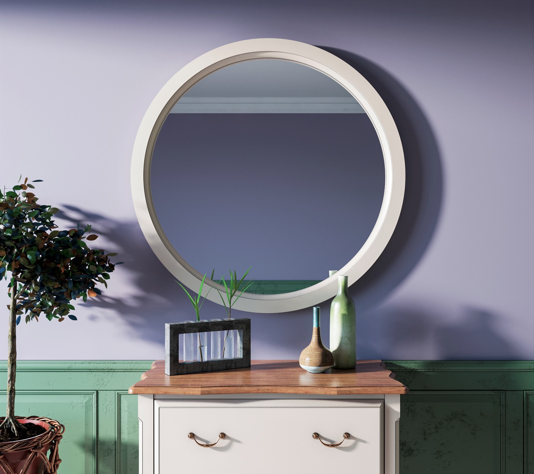 Утонченность и простота идеально сочетаются в круглом, диаметром 90 см, зеркале коллекции Leontina. Округлость формы позволяет визуально расширить пространство и наполнить его свежим воздухом.